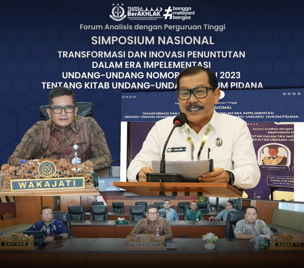 Forum tersebut dikemas dalam acara Simposium Nasional bertajuk “Transformasi dan Inovasi Penuntutan dalam Era Implementasi Undang-Undang Nomor 1 Tahun 2023 tentang Kitab Undang-Undang Hukum Pidana (KUHP)”. Hadir sebagai narasumber yaitu enam akademisi hukum dari berbagai universitas ternama di Indonesia.