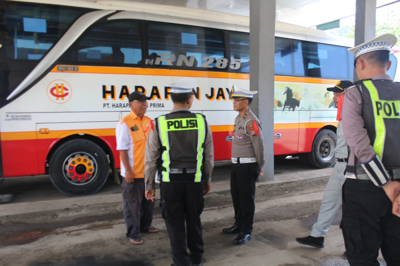 Untuk memastikan keamanan dan keselamatan penumpang, Polres Trenggalek bersama stakeholder terkait menggelar ramp chek kendaraan angkutan lebaran di terminal Surodakan, Kabupaten Trenggalek. Senin, (16/3).