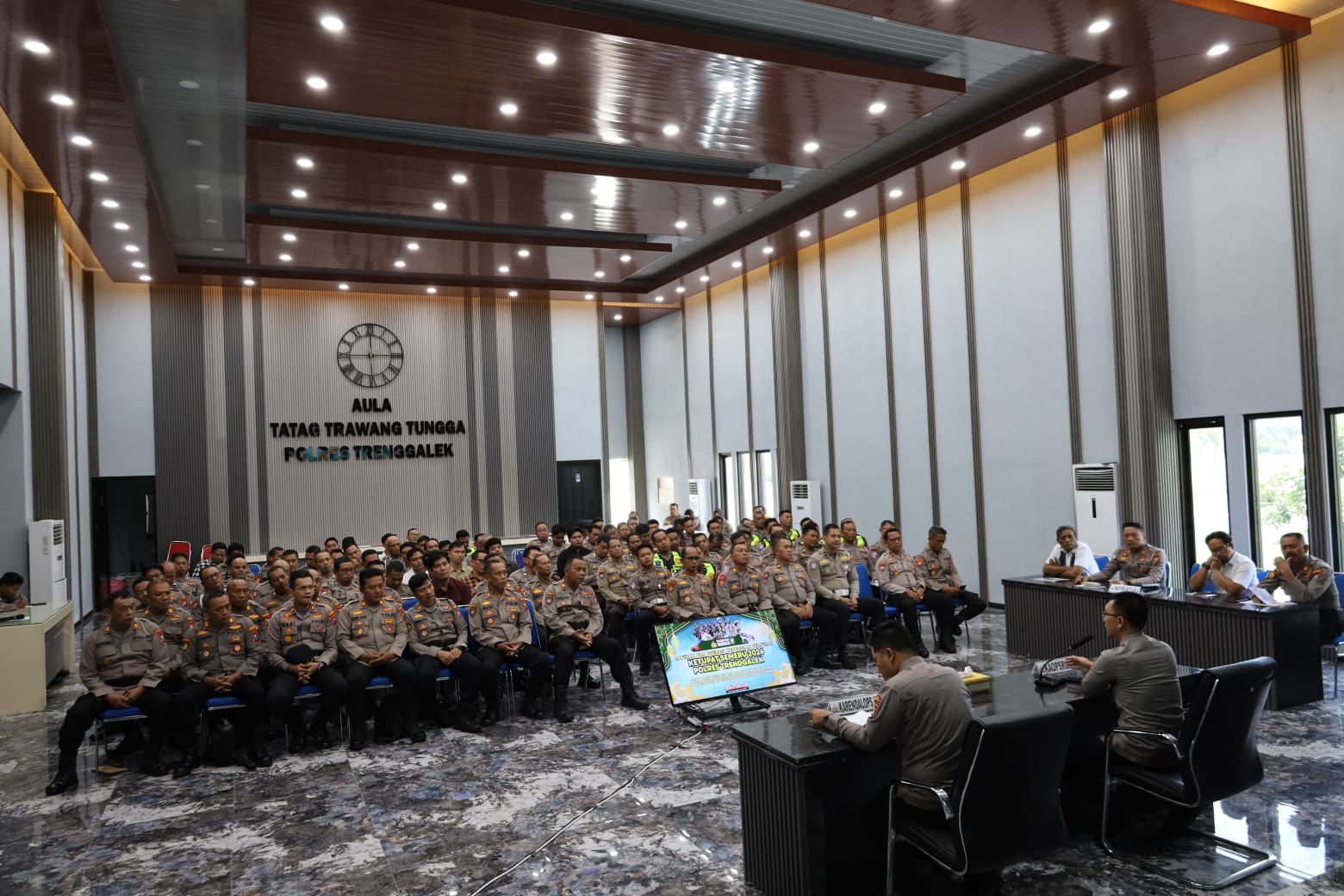 Sebagai bentuk kesiapan, Polres Trenggalek menggelar Latihan Pra Operasi (Latpraops) Ketupat Semeru 2026 di Aula Tatag Trawang Tungga Mapolres yang diikuti oleh segenap personel yang terlibat operasi. Kamis, (12/3).
